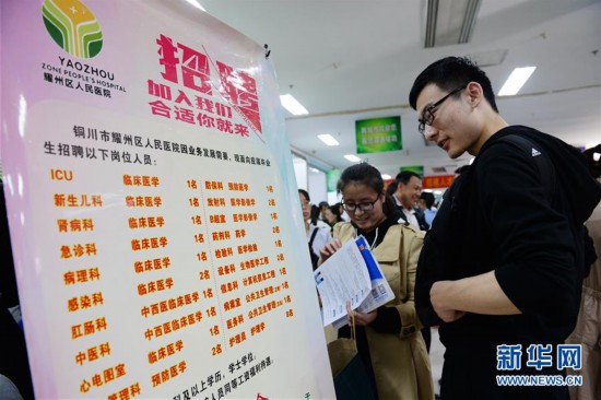 4月1日,學(xué)生在招聘會上了解銅川市耀州區(qū)人民醫(yī)院招聘情況。當(dāng)日,陜西省2018年縣及縣以下醫(yī)療衛(wèi)生機(jī)構(gòu)定向招聘醫(yī)學(xué)類本科畢業(yè)生專場招聘會在陜西省人才交流服務(wù)中心舉行,現(xiàn)場提供崗位2415個,涉及臨床醫(yī)學(xué)、預(yù)防醫(yī)學(xué)、口腔醫(yī)學(xué)、醫(yī)學(xué)影像等專業(yè)。新華社記者李一博攝xuS安康新聞網(wǎng)
