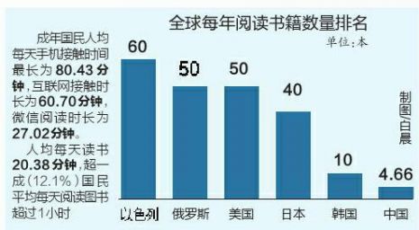 有網(wǎng)絡(luò)資料顯示,全世界每年閱讀書(shū)籍?dāng)?shù)量排名第一的是以色列,平均每人一年讀書(shū)量超過(guò)60本,俄羅斯和美國(guó)均在50本左右,而就算是我們的鄰居日本也達(dá)到40本左右,韓國(guó)較少卻也在10余本的水平。