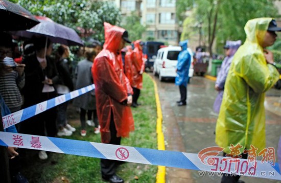 昨日,得知指認現(xiàn)場的消息后,近百名業(yè)主冒著大雨前往事發(fā)單元樓下圍觀。當嫌疑人令某杰被從警車上押解下來時,業(yè)主們再也控制不住自己的情緒,大聲呼喊著,“畜生!嚴懲兇手!”