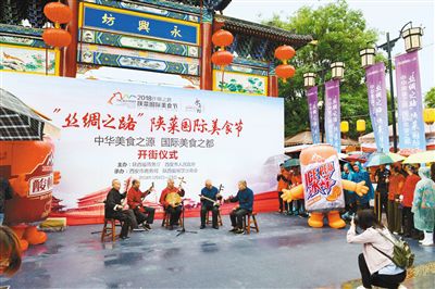 “關(guān)中巷的鄉(xiāng)黨們,陜南街的伙計(jì)們,陜北里的后生婆姨們,擼起袖子加油干,今兒個(gè),咱開市大吉”。昨日上午,記者在永興坊陜西非遺美食文化街區(qū)看到,盡顯老陜豪邁風(fēng)格的“開街儀式”吸引了不少游人駐足。永興坊園區(qū)東邊方言字廣場特設(shè)為“2018‘絲綢之路’陜菜國際美食節(jié)”主題宣傳區(qū),匯聚了陜西107區(qū)縣的百余種非遺美食和土特產(chǎn)品。