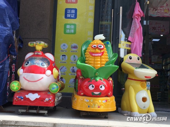 6月4日,西部網(wǎng)記者來到了雁塔區(qū)萬象春天小區(qū)周邊了解情況。記者走訪發(fā)現(xiàn),僅僅這一個(gè)小區(qū)附近,就有近10家店鋪經(jīng)營(yíng)著搖搖車的生意。母嬰店、小超市、連鎖藥店,甚至快遞收發(fā)點(diǎn)門口,都擺放了幾臺(tái)搖搖車,即使在較為炎熱的下午三點(diǎn),仍然有很多低齡兒童由家長(zhǎng)帶領(lǐng)著玩。