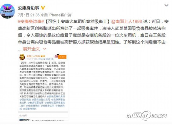 網(wǎng)友微博報料安康一火車司機吸毒被拘留。