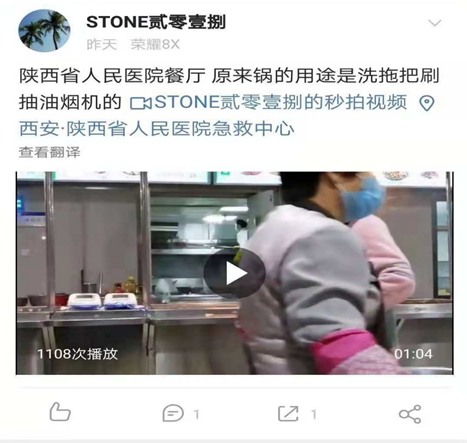 11月6日14:50,“西安直播”等微博號轉(zhuǎn)發(fā)網(wǎng)友爆料:“11月5號,在西安市某醫(yī)院食堂內(nèi),清潔人員站在灶臺上在打掃油煙機上的污漬時,竟直接把清潔油煙機的拖把放到灶臺上的鍋里清洗,絲毫不避諱外面的食客。目前,餐廳方面對此還未作出回應!贝艘曨l同時被“新浪財經(jīng)”、“深圳商報”等多個媒體官微點名轉(zhuǎn)發(fā)。