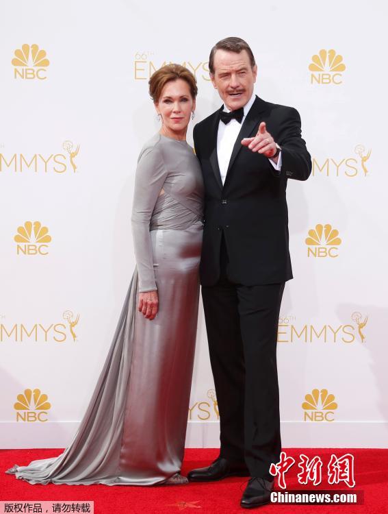 當(dāng)?shù)貢r(shí)間2014年8月25日,美國(guó)洛杉磯,第66屆美國(guó)電視艾美獎(jiǎng)?lì)C獎(jiǎng)典禮舉行,眾星走上紅毯。圖為《絕命毒師》男星布萊恩科蘭斯頓攜妻亮相v6G安康新聞網(wǎng)