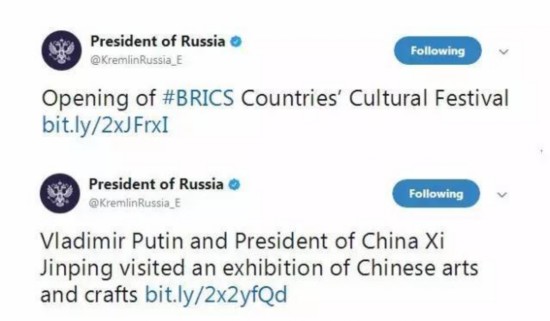 克里姆林宮推特官方賬號則發(fā)了兩條關(guān)于俄羅斯總統(tǒng)普京出席文化交流活動(dòng)的推文,分別是普京參加金磚國家文化節(jié)和中國藝術(shù)品展。人文交流是此次廈門會晤上推進(jìn)金磚合作的一大新支柱。