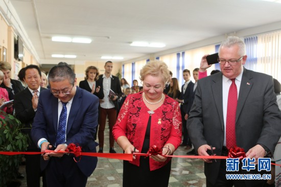 中國(guó)駐白俄羅斯大使館臨時(shí)代辦羅占輝(左)、白俄羅斯第12中學(xué)校長(zhǎng)佩特魯莎(中)和白俄羅斯教育部長(zhǎng)卡爾邊科共同為中國(guó)文化與文字中心剪彩。新華社記者魏忠杰攝Ttc安康新聞網(wǎng)