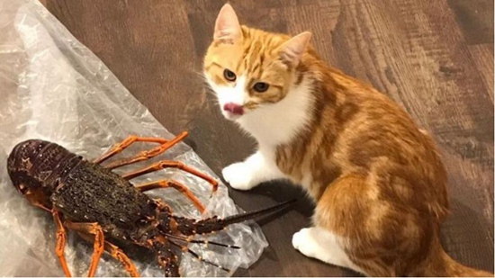 派德斯(Paddles)在大龍蝦面前展示一副饞嘴臉孔。阿德恩總理從收養(yǎng)派德斯不久,這只小貓就爆紅網(wǎng)絡(luò)。