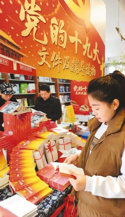 | 10月31日,在安徽省阜陽新華書店內(nèi),市民在十九大文件及學(xué)習(xí)輔導(dǎo)讀物專柜閱讀選購圖書。 |