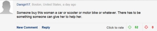 美國波士頓的網(wǎng)友danigiri17寫道:“誰來給她買輛車,或者至少買個小摩托車之類的。肯定有人能夠幫助她。”