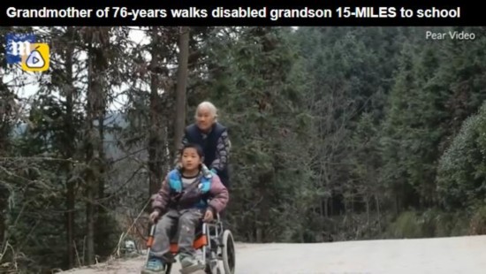 英國《每日郵報》1月22日發(fā)表文章,關注中國廣西76歲老太史玉英的感人故事。老人每天都會步行24公里的路,用一把破舊的輪椅推著患腦癱的孫子上學。報道稱,她“4年如一日,風雨無阻,意志堅強!