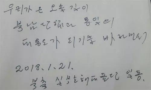 21日,朝鮮三池淵管弦樂團(tuán)團(tuán)長玄松月一行前往韓國,為朝鮮藝術(shù)團(tuán)冬奧會(huì)期間赴韓演出提前“踩點(diǎn)”。當(dāng)晚朝方人員用過晚餐后,玄松月在酒店留言簿寫了一句話:“希望我們走過的羊腸小道,可以成為北南團(tuán)結(jié)和統(tǒng)一的大路”。署名為“朝方實(shí)務(wù)了解代表團(tuán)全體”。雖然內(nèi)容簡短,卻引發(fā)了韓國輿論的猜測。