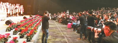 | “親情中華·歡聚巴塞羅那”演出結束后,演員謝幕,觀眾們?nèi)匀徊簧,臺上臺下齊唱《我的祖國》。本報記者 孫立極攝 |