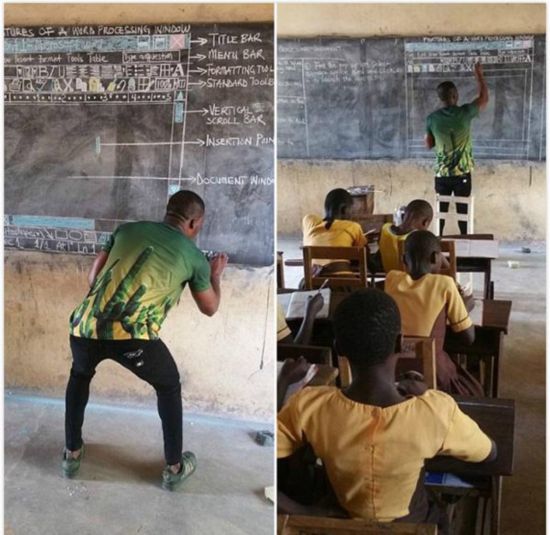 據(jù)英國《每日郵報(bào)》3月1日報(bào)道,近日,一位加納中學(xué)老師在臉書上分享的“獨(dú)門”教學(xué)照片帖子走紅網(wǎng)絡(luò)。據(jù)悉,由于他所任教的中學(xué)沒有電腦設(shè)備,所以他只能使用彩色粉筆不辭辛苦地將電腦屏幕的一個(gè)個(gè)頁面繪制到黑板上進(jìn)行教學(xué)。他給學(xué)生在黑板上畫圖講解如何使用微軟Word的照片發(fā)出后,這位老師獲得了全球的贊譽(yù)。