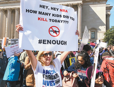 3月24日,來(lái)自全美各地的近50萬(wàn)人涌入美國(guó)首都華盛頓,參加以“為了我們的生命”為主題的反對(duì)槍支暴力大游行。游行者呼吁美國(guó)政府采取更加嚴(yán)格的控槍措施,保護(hù)校園安全,同時(shí)要求政客們不再接受美國(guó)全國(guó)步槍協(xié)會(huì)等團(tuán)體的政治獻(xiàn)金。這一天,從紐約、波士頓、洛杉磯,再到上月發(fā)生校園槍擊案的佛羅里達(dá)州帕克蘭,同一主題的大游行在全美390多個(gè)城市同步舉行。美國(guó)民眾尤其是青少年學(xué)生紛紛走上街頭,響亮地發(fā)出他們的聲音:“面對(duì)槍支暴力,我們不再沉默,政客們必須在控槍問題上有所作為!