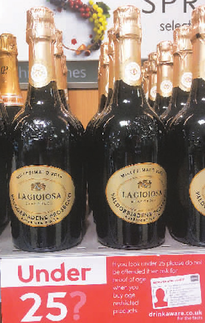 | 這是4月11日在英國巴斯大學留學的陳光耀拍攝的照片。英國巴斯某超市酒類貨架上的標識“如果您看起來在25歲以下,在您購買此商品時我們需要查您的身份信息,請不要生氣。” |