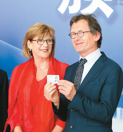 五月二日,上海為伯納德·費(fèi)林加等七名外籍人士頒發(fā)外國(guó)人永久居留身份證和居留許可,這將給他們出入境、在華生活和工作帶來(lái)諸多便利。圖為諾貝爾獎(jiǎng)得主伯納德·費(fèi)林加和夫人一起在展示領(lǐng)取的永久居留身份證。9Lf安康新聞網(wǎng)