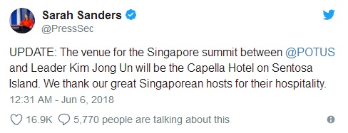 人民網(wǎng)北京6月6日電(姚麗娟) 美國(guó)總統(tǒng)特朗普與朝鮮最高領(lǐng)導(dǎo)人金正恩的首次會(huì)面將于6月12日在新加坡舉行。美國(guó)白宮5日公布了美朝領(lǐng)導(dǎo)人會(huì)晤的地點(diǎn):位于新加坡圣淘沙的嘉佩樂(lè)酒店。