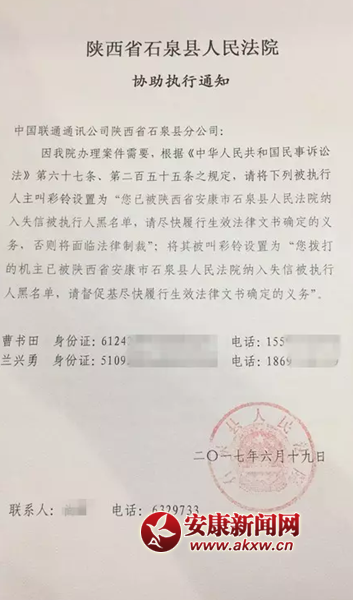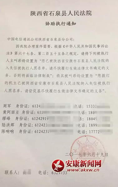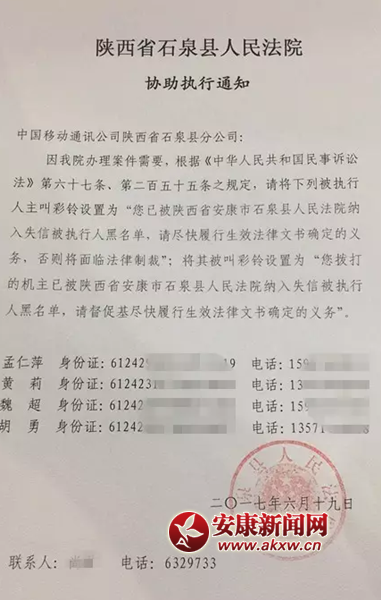 6月19日下午,石泉法院將首批需要進(jìn)行通信限制的11名“老賴(lài)”名單提供給了三大通信公司,要求其協(xié)助執(zhí)行。